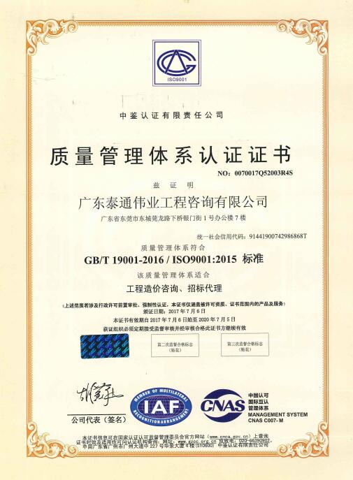 质量管理体系认证证书(中文版)ISO9001-1